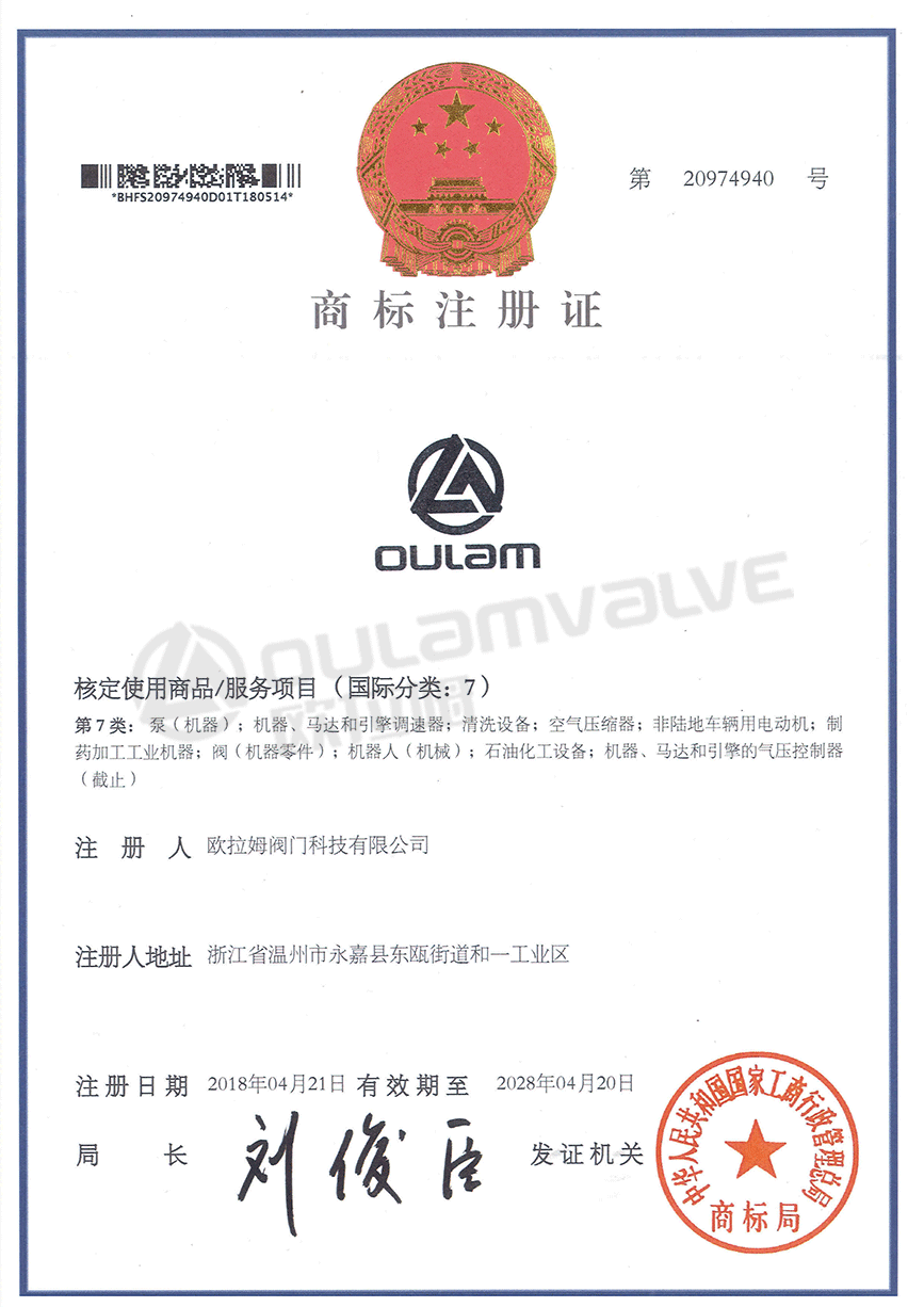 “圓形歐拉姆標(biāo)志英文OULAM”商標(biāo)注冊(cè)證