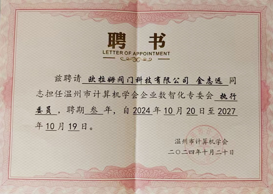 10月26日溫州市計算機學會企業(yè)數(shù)智化專業(yè)委員會成立大會在溫州數(shù)據研究院召開,標志著溫州市在企業(yè)數(shù)智化領域邁出了堅實的一步。在這次大會上,歐拉姆閥門科技有限公司董事長金志遠被聘任為溫州市計算機學會企業(yè)數(shù)智化專業(yè)委員會執(zhí)行委員。